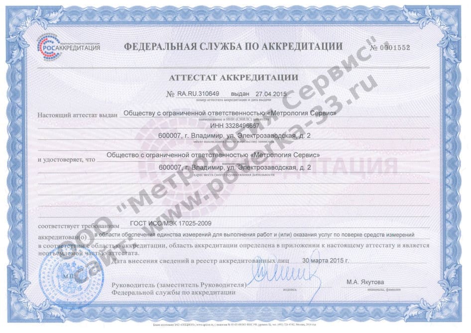 Уникальный номер записи об аккредитации в реестре аккредитованных лиц: RA.RU.310649. Всю информацию о нашей компании можно получить на официальном сайте Федеральной службы по аккредитации (Росаккредитация) https://fsa.gov.ru в разделе "Аккредитованные лица" "Реестр аккредитованных лиц"